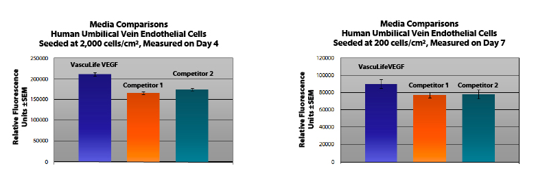 ISO-style标准测试表明 VascuLife VEGF培养基生长HUVEC和其他内皮细胞,其生长速率达到或超过其他商业上可用的含血清培养基,同时保持良好的细胞形态。与其他商业上可用的培养基相比,VascuLife VEGF在不同的播种密度下表现出更好的增殖能力。